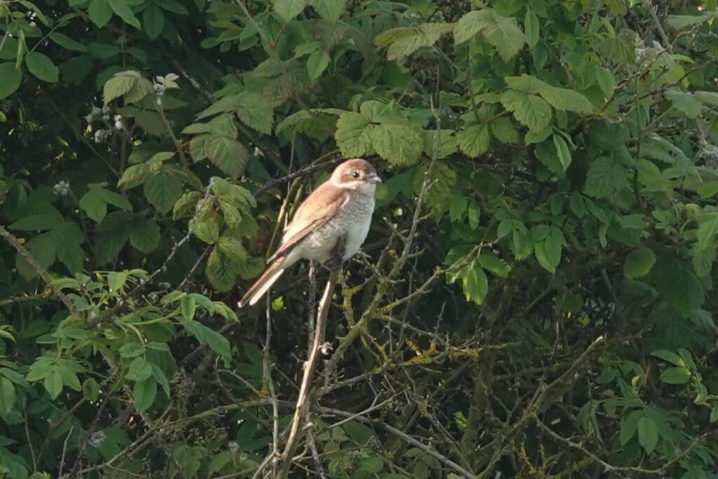There were blustery northerly winds throughout, albeit they were at their strongest early on when accompanied by driving rain; temperatures reached 13 degrees C. Seawatching was rewarded with the year’s first Arctic Skua and a Blue Fulmar flying north, along with single Teal and Knot, 35 Common Scoters, 46 Manx Shearwaters and 334 Puffins heading in the same direction. On the passerine front, a female Red-backed Shrike at South Landing had presumably arrived on the same airstream as yesterday’s Nightjar.