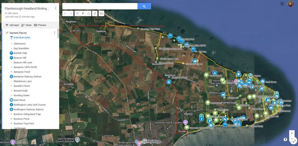 Flamborough Bird Observatory maintains records and operates ringing stations for the whole Flamborough Headland including the Bempton Cliffs RSPB reserve indicated on the map below. The Flamborough Headland Recording Area is broadly the same as the Flamborough Headland Heritage Coast and encompasses the whole area east of Danes Dyke including the village of Flamborough and also, to the west of Danes Dyke, the areas surrounding the neighbouring settlements of Bempton, Buckton and Speeton on the north side of the headland and Sewerby on the south. Records for this whole area are published in our annual reports and daily blogs. Please contribute your counts and photos or records of scarce and rare birds by sending them to fborecords@hotmail.com